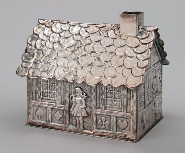 This anonymous ‘Westmoreland Specialty Company Mustard’ still bank is a curious object rendered in glass. Its cube-like structure, adorned with brick-like patterns and a pitched roof, is immediately striking. The materiality of the glass is interesting because it plays with transparency and opacity. The clear glass suggests a structural system of signs—an interplay of visual and cultural codes. The architectural form is intriguing; the structure is almost childlike in its simplicity, with its rudimentary door and window openings. The repetition of brick motifs and the rhythmic arrangement of windows speak to an industrial aesthetic, while the overall structure of the house suggests a sense of domesticity. What could this dichotomy suggest? Is the artist prompting us to question the nature of commerce and commodity?