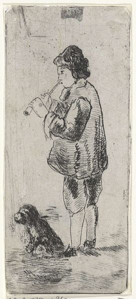 Arnoud Schaepkens created this etching, "Fluitspelende jongen met hond," depicting a boy playing the flute, sometime during the 19th century. Schaepkens, who lived through a period of significant social and political change in Europe, gives us an intimate glimpse into the life of a young boy, perhaps from the middle classes, enjoying a simple pleasure. The presence of the dog suggests themes of companionship, loyalty, and the natural world, which were particularly resonant during the Romantic era. Consider the boy's attire and the details of the flute. What can these details tell us about his social standing and cultural environment? Does the scene evoke a sense of nostalgia or convey a message about the innocence of youth? The subtleties of the composition invite us to reflect on the relationship between individuals and their environment, while also considering the complex interplay between personal identity and social context.