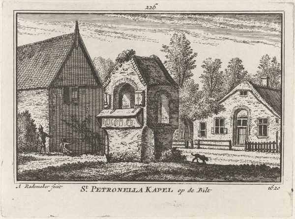 Hermanus Petrus Schouten created this print titled 'View of the Gasthuiskerk in Amsterdam' using etching. Notice how the composition is structured around the imposing form of the church at the center, a solid vertical block that anchors the scene. This central element is balanced by smaller, more fragmented structures on either side, creating a play between stability and asymmetry. The etching technique, with its fine lines and gradations of tone, adds to the overall effect. Schouten’s formal arrangement reflects a society in transition, with the church standing as a monument amidst the daily lives of ordinary people. This juxtaposition isn't merely aesthetic, it invites us to consider how traditional institutions coexist and intersect with everyday life. The formal qualities of this etching serves as a lens through which we can interpret the cultural and philosophical landscape of the period.