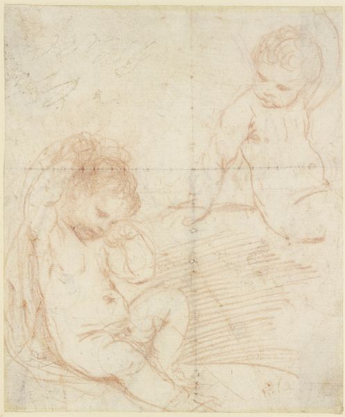 Curator: This drawing by Giulio Campi, around 1530, entitled *Studies of Figures and a Hand*, is striking. Its sparse use of line and simple material, a reddish chalk, creates a sense of immediacy. What are your first thoughts about it? Editor: The quick, sketched lines definitely give it a feeling of being a preliminary study. I’m also intrigued by the range of figures – from what looks like a putto to a draped, standing figure, all rendered in this earthy, sanguine color. It's quite captivating, but I am unsure how to read its various components and their connection. What can you tell me about this work from your perspective? Curator: Well, thinking materially, drawings like these were essentially byproducts of workshop production, functional items. But they also provide glimpses into the Renaissance workshop. Note how the artist utilizes the red chalk. It’s economical but also expressive, allowing for shading and contouring with subtle variations in pressure. Consider how labor is embodied here. A drawing such as this allowed the Renaissance workshop master to transmit stylistic and technical knowledge. Editor: So, it's less about individual genius and more about the collaborative labor involved in artistic production at the time? Curator: Precisely. These studies demonstrate how a single sheet could become a repository of ideas, forms, and techniques, circulating within a workshop and contributing to a larger system of artistic production and dissemination. Consider, also, that these are materials intended not for display, necessarily, but as tools of learning and refining for use among artists. Editor: That’s a completely different perspective than what I would’ve initially assumed, thinking about this work in terms of composition or symbolism! I hadn’t really considered the social fabric woven into these studies. Curator: Right. By considering its production and usage, we understand how knowledge was transmitted, and labor divided within the artistic community. It is, in some respects, more revealing than the polished, final product. Editor: That’s fascinating. Looking at it this way really demystifies the art-making process, making it more grounded and understandable. Thank you.
