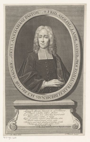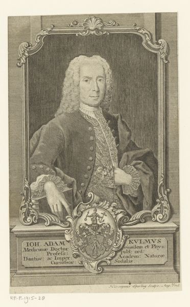 Editor: This engraving, "Portret Guillemus Camdenus Clarentius" by Johann David (I) Schleuen, made sometime between 1721 and 1771, has a certain formality, even austerity to it. What social and historical dynamics might be at play in how this portrait was conceived? Curator: That's a crucial entry point. Given the subject and the time, consider the portrait's function. Beyond memorializing an individual, how might this image of a powerful white male reinforce existing power structures? What is Camden's positionality, and how does that intersect with the visual language of status in this Baroque print? Editor: It feels almost like propaganda in some way, maybe setting Camden up as a leader or role model? Is the medium itself—engraving—significant? Curator: Exactly! Engravings like this were often reproduced and disseminated widely, effectively controlling narratives. Think about access – who was commissioning these portraits, and whose gaze are they designed to capture and influence? Consider too that displaying someone’s coat of arms visually asserts familial legacy and right to authority. The trappings around Camden serve to underscore that social privilege. Editor: That makes so much sense. So it's not just about remembering someone, but promoting a very specific, carefully crafted image linked to power. I’m now curious about the contemporary reception to such portraits. Curator: Precisely. By exploring reception we uncover both intended and potentially unintended impacts, which furthers our awareness of representation's ongoing role. Now what about portraits made today? Are these power dynamics at play in our current modes of portraying people? Editor: Definitely a lot to reflect on; thinking about images as assertions of social and political ideas makes me see the work with new eyes!