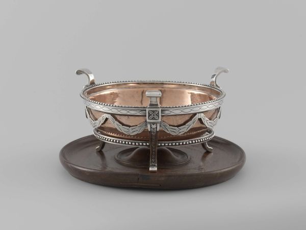 Curator: Before us is a 'Kap van zilver,' or silver cap, dating from around 1785 to 1800, created by Jacobus Carrenhoff. It exemplifies the Neoclassical movement through a decorative art lens. Editor: My first impression? Restraint. The severe form in bright silver suggests the dignity and austerity so sought in the late 18th century, but where is the riotous play of Baroque form and symbol? Curator: Precisely. Consider the metalwork: the pure arc of the band is so smoothly rendered. The formal simplicity speaks of classicism’s revival. Notice too the minimal decoration; this contributes to its cool perfection. Editor: Indeed, and such objects, made of precious metals, must surely signal power. Caps, like crowns or diadems, connote authority. Though in a form shorn of excesses. This must have belonged to a woman who wished to project control, order. Do you see similar symbols in its ornament? Curator: In its small scale floral clasps, perhaps a discreet echo of natural beauty subjected to reason’s firm rule. We find an elegance arising from precision of structure. Editor: Silver also has a curious relationship to folklore: a shield against darkness. While its Neoclassical context projects enlightened rationality, could we also entertain its role as talisman, for this wearer? Did this woman view it purely for its aesthetic design, or with a belief in its potential for symbolic fortification? Curator: A tempting idea. One cannot deny the confluence of rationalism with existing folk belief at this period. Editor: By contemplating how this culture imbued 'Kap van zilver' with meaning – as symbol of power, as exemplar of rational style – the cap bridges past ideas with modern inquiry. Curator: Indeed, reflecting on it in such diverse ways enhances our awareness that function and significance are not invariably disparate.