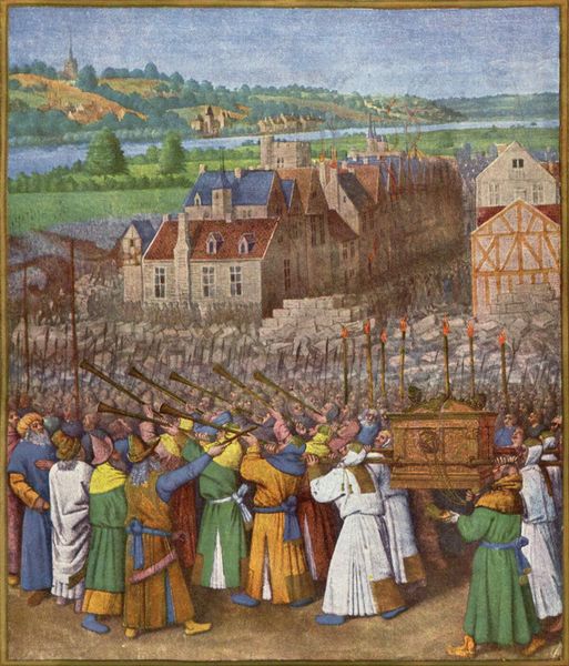 Curator: Jean Fouquet painted "King Clothar II cannot bring back his son Dagobert I to Paris" in 1460, currently held at the Bibliothèque Nationale de France. It’s done with tempera on a panel. Editor: My first impression is one of stark contrasts: a city teeming with light in the background versus the dark tragedy unfolding in the foreground. The composition feels carefully staged, almost like a theatrical tableau. Curator: Yes, and notice how that darkness permeates the visual narrative. It speaks volumes about the historical context and the potent symbolism of a father’s powerlessness over death, which resonates even now. This miniature captures the drama when King Clothar attempts, in vain, to move his deceased son Dagobert's remains to Paris. The cityscape behind hints at Paris as a symbolic beacon, a center of power and culture. Editor: It’s interesting how Fouquet uses a miniaturist's scale to depict such a grand historical moment. There is almost a disconnect, it seems, between the intimacy of the size and the gravity of the event. How do you read that contrast? Curator: I read it as deliberate. Miniatures were often intended for private contemplation. Fouquet transforms this personal viewing space into a stage for meditating on themes of loss, succession, and the fragility of life—themes encoded with cultural values of loyalty, family honor, and leadership, still recognizable today. Editor: Let's talk about the palette: there’s a deliberate use of gold to highlight the royal figures, pulling our eye even though the shadowed figure is meant to be our focus. The contrast enhances their status. Do you think Fouquet effectively uses color here to direct the narrative and emotion, or does the balance fall somewhat short given his medium? Curator: Oh, he uses it masterfully! The colors, even those reserved for death, like the muted blue and blood red inside the building, have a stark brightness that emphasizes the reality, that communicates loss with precision. It creates a powerful emotional connection and underlines themes of power and succession. Editor: Considering its diminutive size and material—tempera—I have to admit its visual impact and complexity, for a painting about the failure of succession, is impressive. The interplay of the macro (city) and micro (emotion) resonates deeply. Curator: I agree. Seeing the image helps reveal why Fouquet's illumination of history resonates through centuries. He has revealed not only the king and his city, but something about all of us in moments of mortality.