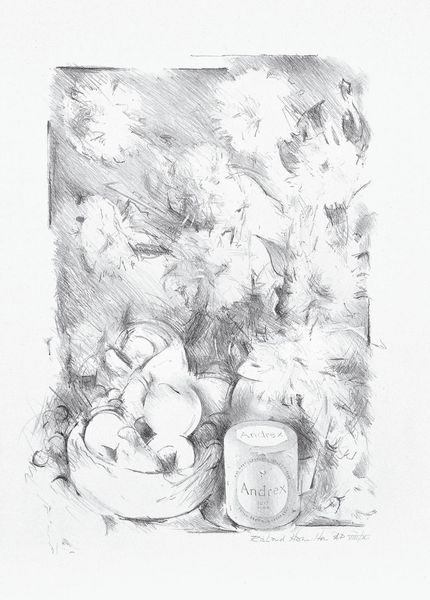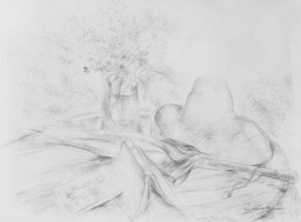 Editor: So, this is "Collective Farmer," a pencil drawing by Kateryna Bilokur, from 1949. It's incredibly detailed; the composition feels almost dreamlike. What symbols stand out to you? Curator: I am struck by how the imagery speaks to the cyclical nature of life and labour, with motifs that hold deep roots in Ukrainian culture. Look at the central table overflowing with food; the laden table suggests bounty and hospitality. Does this abundance feel genuine, or forced in any way, particularly given the historical context of its creation? Editor: Forced? I hadn’t considered that. Given the date, 1949, it could allude to the famines. The "Collective Farmer" seems placed on the margins, an observer almost, rather than a benefactor, set amid that landscape and framing. Curator: Precisely! Bilokur imbues seemingly simple objects with a multilayered meaning. Note the progression from the domestic interior to the ripe crops surrounding the farmer. Doesn’t this suggest a specific role being imposed or a traditional one maintained, particularly concerning woman's labor during that time? Also note how domestic and 'wild' flora overlap...what feeling does that produce? Editor: It definitely complicates the reading of the image; the abundance around the table, the domestic setting framed by what appear as fields - or what grows on them, and a person near other abundant fruits. Curator: Bilokur might invite a visual experience. As such, she gives weight to cultural memories within the iconography. The fields could signify a utopian agrarian dream. What happens to our experience if that dream has gone sour? How does that context shape our engagement? Editor: That adds a darker layer, then, and I never suspected. Thanks for highlighting how the symbols function in the artwork, which have led me into the context of the artwork! Curator: It also works both ways: context helps unlock further significance. It's about how we negotiate historical narratives through visual symbols, making visible the cultural weight each of us bring to interpreting them.