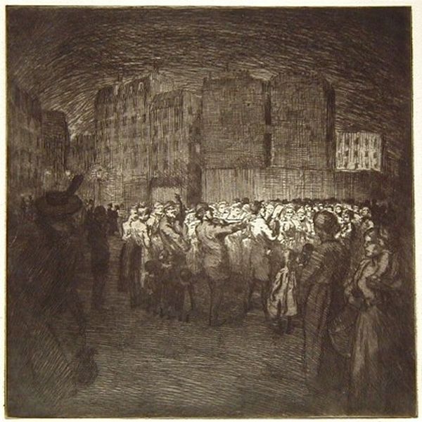 Curator: Gerald Pryse's "Antwerp, 10 September 1914" captures a moment during the early days of World War I. The print measures about 30 by 29 centimeters. Editor: It's stark—a somber, almost dreamlike composition. The architecture looms, while figures in the foreground appear transient and impermanent. Curator: Note how the etching emphasizes the play of light and shadow. Pryse was likely commenting on the disruption of civic life, perhaps even the displacement of people. Editor: Yes, the dense cross-hatching creates an almost oppressive atmosphere. It speaks volumes about the mood of the city at that time. And yet, the buildings, though imposing, almost seem to watch over the people. Curator: The material production is interesting, too. Printing allowed for the wide distribution of such images, shaping public perception of the war. Editor: Exactly. This image, in its own way, is quite beautiful. It draws me into the scene. Curator: Indeed, Pryse provides us with a poignant reminder of the impact of conflict. Editor: Right, a reminder etched into the very materiality of the artwork.