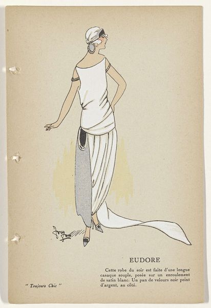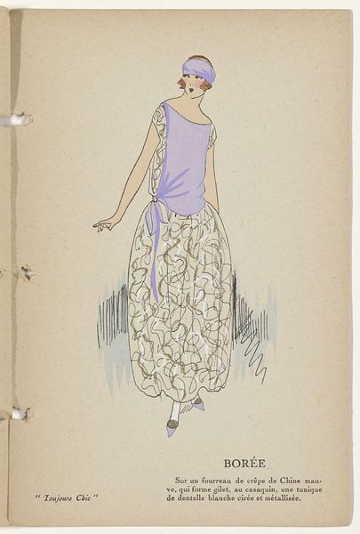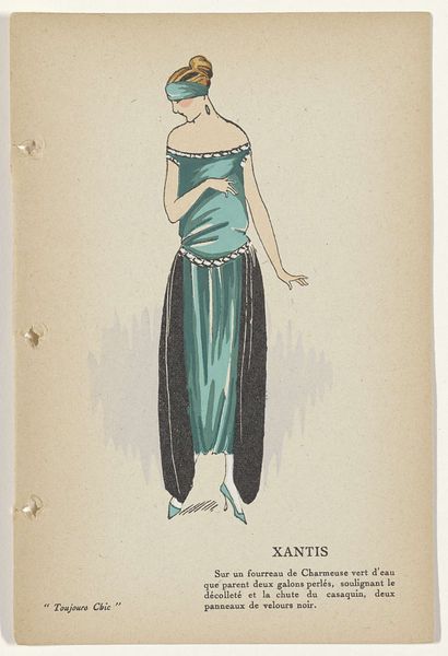 Curator: This piece, "Toujours Chic, Toilettes de Soirées, Hiver 1921-1922: Psylle," by G-P. Joumard, offers a glimpse into the world of early 20th-century fashion. It's a delicate watercolor and ink drawing currently held at the Rijksmuseum. Editor: It strikes me immediately as an echo of longing, something about the diffuse aqua-green at the base suggests faded memories. Curator: I see that! The palette speaks to that restrained elegance popular after the austerity of World War I and before the full-blown exuberance of the late twenties. These fashion plates often functioned as aspirational documents, constructing social identity. Editor: Absolutely, it's carefully constructed—that stylized figure with her precise flapper headband feels iconic, distilled to its essence as a fashionable object. The sharp lines, bordering on floral art deco. What cultural assumptions does it carry? Curator: Think about the role of magazines like *Vogue* or *Harper's Bazaar* at the time; Joumard and his contemporaries worked in that space, reflecting and directing tastes in rapidly changing times for the increasingly visible woman. The choice to include text about the garment creates a very compelling impression for women, their independence and economic roles during this time in France and elsewhere. Editor: So this isn't just fashion illustration; it is a document of social change, suggesting this fluid, liberated style also touches on the figure and the societal conventions imposed on it. And how might period understandings of beauty or desirability shift interpretations? Curator: Exactly, that interweaving is critical! "Psylle," the title, makes me wonder what psychological depths are evoked by that name? Are we to read something profound into her image? What subconscious aspects were emerging to define women during the inter-war period. Editor: I'm left pondering how ephemeral the image feels, yet the social and cultural narratives it holds continue to resonate. The woman it portrays and who she might be remains elusive, a shimmering dream as real as fashion might propose. Curator: Indeed, these drawings continue to pose critical questions about the artifice of appearance, representation, and identity constructions, always through the symbolic power of clothing.