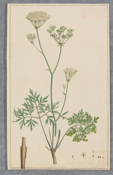 This is a print of poison hemlock from the Plants series, made by Louis Prang & Co. sometime between 1800 and 1950. The composition is dominated by a central stem that rises vertically, drawing the eye upward, while the leaves extend to the left, creating a visual imbalance. This asymmetrical arrangement contributes to an unnerving tension. The muted green and cream palette evokes a sense of organic decay. The textures, achieved through delicate linework, simulate the plant’s surface. The meticulous detail, especially in the leaves, suggests a scientific desire for accuracy, yet the overall effect is far from objective. The image destabilizes the traditional botanical illustration, which is used to document the natural world, by highlighting the plant's poisonous nature. As such, the print serves as a warning. Note how Prang emphasizes the plant's lethal qualities through contrasting color and texture. This isn’t just a depiction of nature, but a moral signifier, reminding us of the hidden dangers that lie in the natural world.