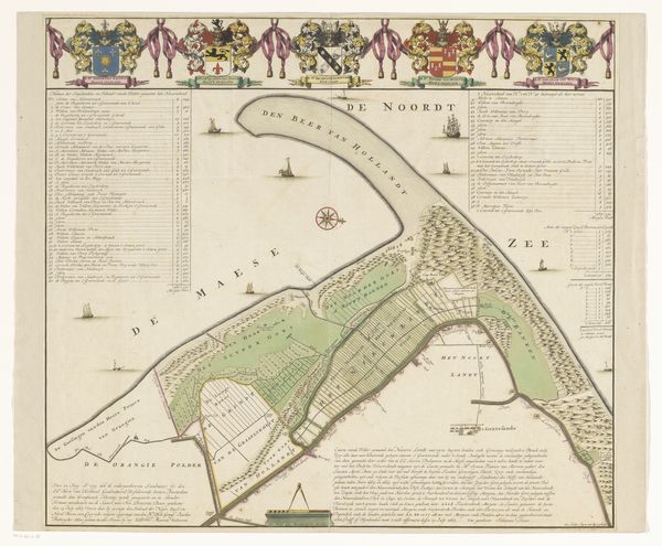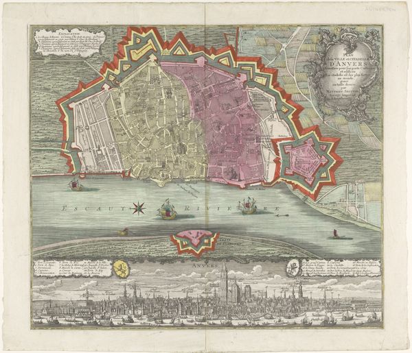 Curator: Look at this striking "Plattegrond en profiel van Rotterdam," a combined map and profile view created by Matthaeus Seutter III, dating from approximately 1731 to 1777. The engraving and etching provides a detailed snapshot of Rotterdam. Editor: My first impression is that of a highly ordered, almost idealized view. It’s colourful but muted. Despite its age, the composition feels incredibly modern, particularly the split between the map above and the city's profile below. Curator: Absolutely, and consider how that combination itself presents a deliberate visual argument. Maps during this period were as much about power and prestige as they were about geographical accuracy. Having both views underscores Rotterdam's significance as a trading center and fortified city. Note the strategic placement of symbols and figures! Editor: Precisely. The figures, likely allegorical, feel Roman, almost theatrical, adding another layer. Notice the contrast between the meticulously gridded city plan above, almost jewel-like, versus the busy, almost chaotic activity depicted in the skyline profile. Does this division intentionally highlight order versus reality? Curator: A vital point. Also, consider the history of Rotterdam itself. The period between 1731 and 1777 witnessed significant economic growth for the city, driven by maritime trade. Seutter’s print subtly reflects this prosperity and projects an image of stability and control. The placement of text feels considered, framing the map in such a way to be like looking at an altar painting. Editor: That economic aspect certainly feeds into my iconographic interpretation. The ships, repeated and abundant, stand as obvious symbols of Rotterdam’s power. I think about the Dutch East India Company, and the power invested in these shipping routes to Asia. They really speak of a globally reaching ambition. Curator: And let's not overlook the choice of using printmaking. It allowed for wide distribution of the image, serving almost as civic propaganda, boosting Rotterdam’s image across Europe. The map served a practical function but was also designed to convey prestige. Editor: Looking at "Plattegrond en profiel van Rotterdam" and discussing it together highlights that artwork transcends simply being a guide; it becomes a historical symbol of pride and mercantile force. Curator: Indeed, and the conversation encourages deeper reflection on how early modern European cities viewed—and wished to present—themselves.