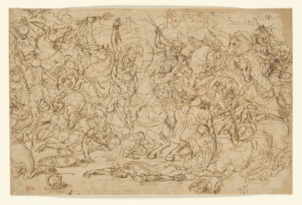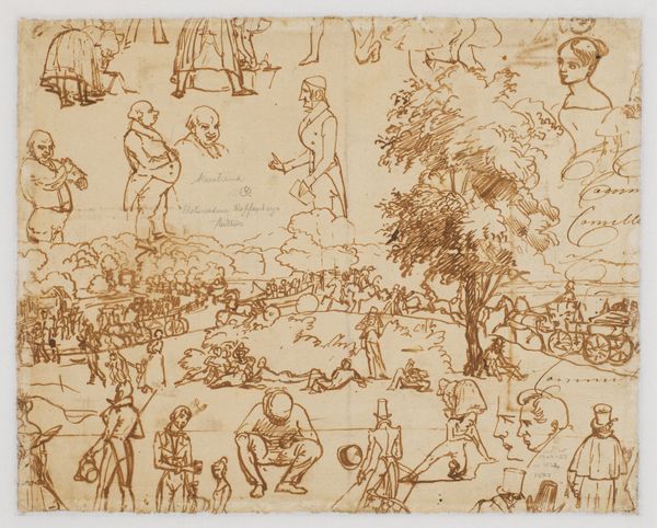 Curator: Rodolphe Bresdin, a French artist from the 19th century, gives us this flurry of activity in his "Sheet of Studies of Figures". It’s a pen and brown ink drawing. Editor: My first thought is...chaos. But a purposeful chaos, a riot of figures swirling across a tiny stage. It feels like watching a battle, or maybe a fever dream. Curator: Bresdin was a master printmaker, and these dense, chaotic scenes are quite characteristic of his style. He used the pen to achieve what could have become an etched plate. Editor: Look at the labor that went into this single drawing. All those tiny strokes, all that brown ink... it's a testament to the sheer physical act of making art. Curator: There’s such a feeling of movement despite its tiny size. All the hustle and bustle. It does feel like something important is about to unfold. Editor: It certainly makes you ponder the role of the artist as a laborer, transforming base materials into something so evocative. I'm struck by the connection to printmaking, where the labor of creation is so tangible. Curator: It really stays with you, doesn't it? A small work with big impact. Editor: Absolutely. It's like Bresdin is inviting us to witness history being crafted, stroke by stroke, and invites us to look closely at how the work itself was created.