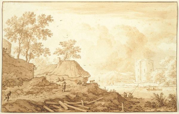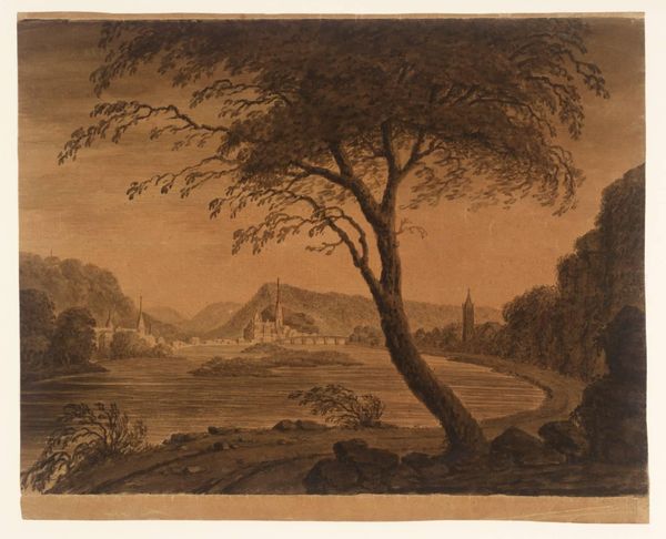Curator: Here we have Alexander Cozens's, "Coast Scene with Ship and Clouded Sky," a work held in the Tate Collections. Editor: It evokes such stillness—a world captured in sepia, where water and sky meet in hazy contemplation. Curator: The materiality speaks volumes, doesn't it? Cozens's technique, the layering of washes, creates a palpable sense of atmosphere. We see a direct record of his engagement with the making process. Editor: And consider the ship, a recurring emblem of journeys, of transition. It hints at the psychological seas we navigate, the horizons of our own minds. Curator: Perhaps. Or perhaps it's about the practicalities of 18th-century trade, the shipping routes, the exploitation of resources that defined the era. Editor: It's fascinating how the same image can whisper of both the external and internal worlds. Curator: Indeed, Alexander Cozens offers us a glimpse into landscape both as observed and constructed through a particular artistic process. Editor: An image pregnant with meaning, reflective of our shared humanity across time.
