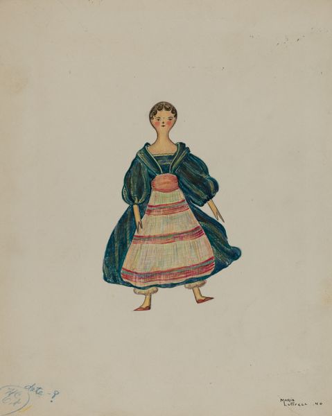 Editor: So, here we have Archie Thompson's "Rag Doll," created around 1940. It seems to be made of pencil and pastel. I’m really drawn to its folk art style. What do you make of it? Curator: It's quite fascinating how this unassuming doll image becomes a repository of cultural memory, isn't it? We are drawn to folk art styles because we are actually yearning to engage with the idea of a simpler life. We should explore why we find a cultural touchstone in an inanimate object, carefully constructed. Consider how its innocent appearance might mask a deeper longing. Editor: I never really considered the idea of a deeper longing! It makes me wonder, is it perhaps, a longing for the past? A connection with simpler times, before mass media, and all sorts of distractions? Curator: Precisely. Dolls have a history as effigies, stand-ins, and even wish fulfillers. The "innocent" depiction of a child's play thing has a lasting effect. What memories or emotions does this particular image conjure in you? Editor: Well, to me it seems so quaint and harmless. Maybe that's why it's jarring to hear it may reflect something other than what it is? I do think that if I was a child during that time, having it on display may make me feel comforted. Almost as if it's keeping watch of the surrounding areas, while at the same time protecting its innocence, so to speak. Curator: See how quickly this symbol has allowed you to consider the image's presence! So, in viewing it that way, we are both now participants with shared human connections of our ancestral past. And this continuity reinforces cultural understanding across generations, enriching our present lives. Editor: Thank you for illuminating the depth in this seemingly simple drawing. I appreciate learning to connect it to cultural memory.