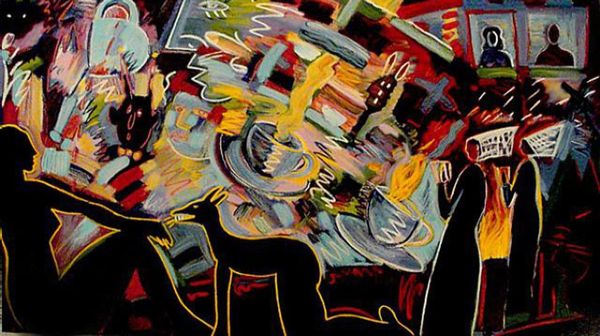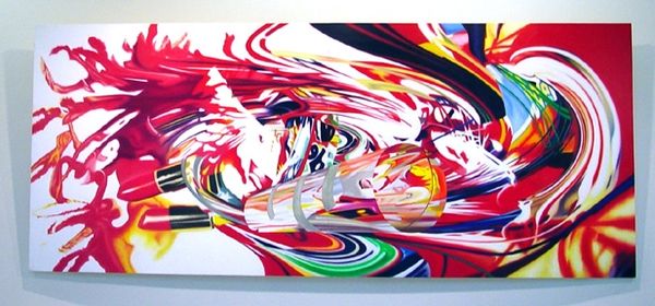 Editor: Here we have James Rosenquist's 2000 painting, *Stowaway Peers Out at the Speed of Light*. The explosion of color and abstract shapes feels so chaotic! What do you make of this composition? Curator: The 'chaotic' nature you observe is interesting, because it echoes a particular moment in the history of artistic representation. Rosenquist came from Pop Art; he really embraced the commercial aesthetics and incorporated a modern visual language of billboards. This piece makes me consider how that past filters through his later work, especially at the turn of the millennium. Do you think the ‘stowaway’ in the title has any bearing here? Editor: That's interesting. It feels like you’re suggesting this is like… sneaking a look into the future through this visual language? Curator: Exactly. It’s about that surreptitious viewpoint of modernity. Speed, in the title, ties directly to the Futurists’ manifestos and the ambition for a visual idiom reflecting modern life, only it comes over a century later. He gives us this image filtered through a culture of Pop Art and advertising – do you think that context adds or detracts from its commentary? Editor: I hadn't really thought about its placement in art history that way. To be honest, without your pointing that out, it just looked like a bunch of colliding colours to me! Curator: Rosenquist seems conscious of inserting himself into the artistic trajectory by ‘stowing away’, to me. Consider how Pop Art forced the hand of institutions to reckon with 'low art', the images of everyday life. We see here, at the turn of the millennium, Rosenquist reasserting this disruptive force in an expanded visual field. He forces us to reconsider the definition of imagery as commodity, and perhaps pushes what painting, and public image can achieve. Editor: So much to unpack! Thanks, I will never look at this in the same way again.