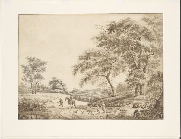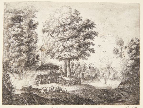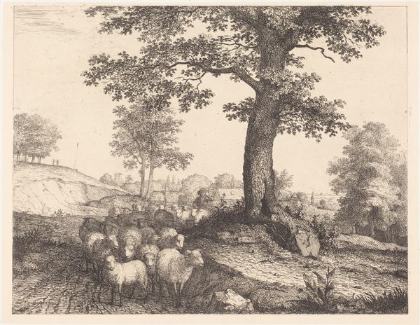 Editor: So this is "Return to the Farm," an etching by Alphonse Legros. There isn’t a specific date listed. I’m struck by how it seems to depict a moment of rural hardship, but there is beauty and grace in the landscape too. What does it say to you? Curator: I see it as Legros commenting on the social realities of rural life during a time of great change. The figures appear burdened, which draws my attention to how industrialization impacted agrarian communities. Consider the title – “Return to the Farm.” The "return" suggests a cycle, maybe an economic or environmental necessity, with the characters seemingly resigned to a life tied to the land. How do you interpret their relationship with the landscape? Editor: That's interesting. I was thinking the landscape felt supportive, but maybe I'm romanticizing it. It also could be commenting on class differences – who gets to enjoy the countryside and who is stuck working it. Curator: Precisely. Realism in art wasn’t just about depicting things as they appear, but about portraying the lived experiences of people, especially those marginalized. Look at the detail in the trees versus the relative anonymity of the figures. What might Legros be trying to say? Editor: I see your point. Maybe the landscape is eternal and indifferent, whereas the figures are trapped within a cycle of labor. Thanks, I didn't initially see it that way, but now I do. Curator: Considering this work, it prompts a crucial dialogue: how do we ensure sustainable relationships between people and the environment, ones that value both equally? Editor: It's a reminder that we should approach images like this with an eye towards the social commentary and class consciousness that artists can evoke.