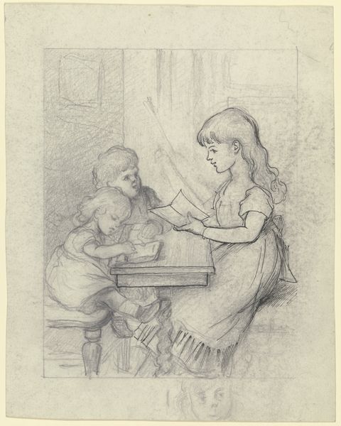Editor: This drawing by Otto Scholderer, called *Zwei Kinder füttern eine Puppe,* depicts two children with a doll. It's made using pencil and chalk. I’m struck by how dreamlike and fleeting it feels, almost as if it's a memory fading away. What stands out to you in this piece? Curator: The echo of a memory is palpable, isn't it? It invites contemplation on the symbolism inherent in children at play. The doll, of course, becomes a locus of projection. What anxieties or aspirations do you think these children, or perhaps Scholderer himself, are externalizing onto that inanimate object? The feeding gesture, seemingly simple, hints at nurturing, control, perhaps even a mimicry of adult roles and the weighty burdens of responsibility. Notice how the figure on the left almost appears spectral. What emotions does it stir within you? Editor: I feel a little unsettled, perhaps because the other child looks faded, like she might disappear completely. Maybe it speaks to the transient nature of childhood, the way memories shift and fade with time? Curator: Precisely! The artist subtly directs our attention to childhood’s fleeting nature and, more broadly, to life's ephemerality, as something to cherish, while considering the anxieties related to a young person's growth, dreams, and expectations. The chalk and pencil create soft contours that speak to delicacy. Editor: That’s interesting; I didn't consider the use of the chalk and pencil like that before! Curator: Consider how often artists choose specific media to mirror or amplify the themes they are addressing. Each mark, each shade holds symbolic value. Editor: Looking at it now, it really highlights the theme, giving a fresh way to view childhood’s transience, using simple things. Thanks for that.