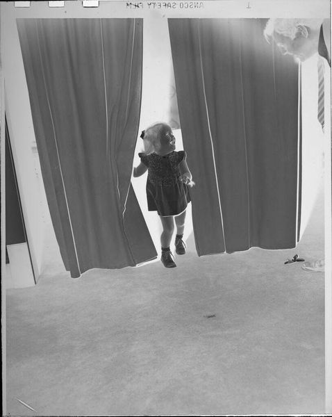 Curator: This is an untitled photograph by Jack Gould, currently held at the Harvard Art Museums. The work presents children dancing in a class setting. Editor: There's such raw energy! The high-contrast tonality makes it feel almost like a dream or a memory. Curator: The composition is intriguing. Note how the vertical lines of the children's legs and the pillar create a structured, almost architectural framework. The repetition adds rhythm. Editor: For me, it's more about the vulnerability. Those kids, trying so hard to be graceful... it's touching. I can almost hear the piano and the instructor's voice. Curator: Indeed, Gould captures a specific moment, freezing their movement. The reversed image heightens the formal qualities. Editor: Absolutely. This image reminds us of the beauty in imperfection and the fleeting nature of childhood. Curator: A compelling image which captures light and movement with unexpected intensity.