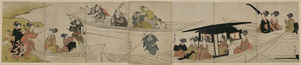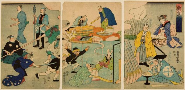 Curator: This compelling woodblock print is titled "Triptych: Nocturnal Battle in Rain," created by Utagawa Yoshikazu, who lived a tragically short life between 1845 and 1870. Editor: It's intense, isn't it? The way the rain is rendered with those stark, straight lines really creates a feeling of claustrophobia and chaos. Curator: Absolutely. Yoshikazu's work emerges during a period of immense social upheaval. Woodblock prints were a means of mass communication, reflecting and shaping public perception. The battle scene might depict struggles over resources or political power during the late Edo period. Editor: I'm struck by how much of the imagery here emphasizes the production of violence. Look at the swords, the poses. Each character appears to be a specific player in the labor of war. It's not romantic at all. Curator: Yes, and the triptych format itself suggests a narrative unfolding across time, mirroring the social unrest of the era. This print, now preserved at Harvard Art Museums, offers a glimpse into a turbulent past. Editor: A reminder that even art depicting conflict is made by human hands, shaped by specific material conditions. Thank you.