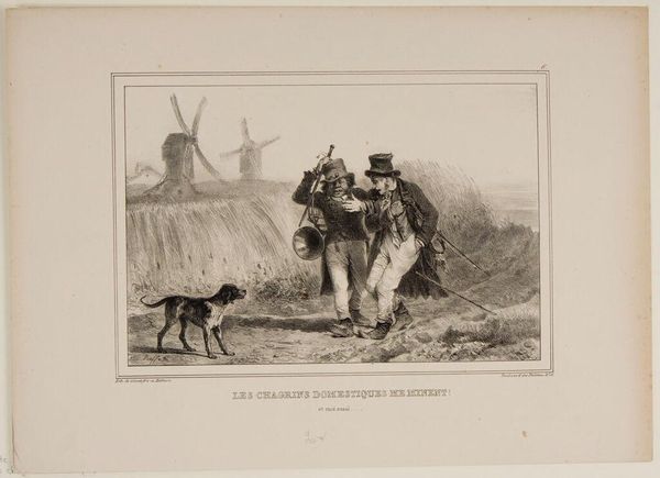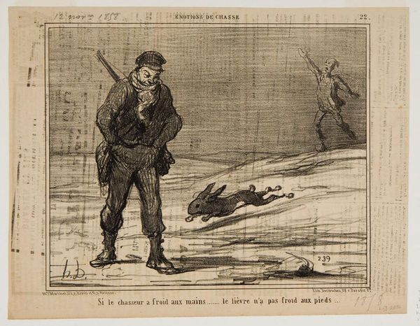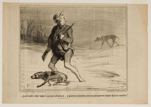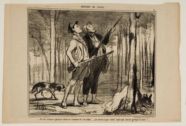Curator: This is an intriguing lithograph by Honoré Daumier. It's titled "What the devil could he really have in this thicket? ...Maybe it's a tiger?..." Editor: My immediate thought is fear—not just the obvious visual depiction, but something more primal, linked to what the forest has always represented in our collective unconscious. Curator: Yes, look at the caricature of the hunters. Daumier critiques the bourgeoisie through his recurring motif of the hunt as a symbol of their futile pursuits. The lithographic process, a relatively cheap means of reproduction, allowed for wide dissemination of his social commentary. Editor: And the tiger—or the *idea* of the tiger—becomes a potent symbol of the unknown. The irrational fear is almost comical but taps into something deep. Consider the broader cultural context of the hunt. Curator: Absolutely. This would have been circulated as part of a series in a Parisian journal, reaching a broad audience invested in the political implications of imagery. The labor of producing these images made Daumier into something of a hero for the working class. Editor: Exactly, and the artist's choice of medium, lithography, lends a certain rawness that enhances the image's emotional impact, tapping into deeper anxieties. Well, that certainly gives a fresh perspective on a familiar subject. Curator: Indeed. It really highlights the confluence of material conditions and cultural anxieties at play in Daumier’s work.