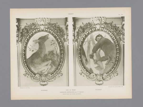 Editor: So, we're looking at "Twee panelen met representaties van mei en juni in het stadhuis te Nancy," created before 1896. They appear to be drawings made with pen on paper. What strikes me is the contrast – on one panel we have a loving embrace, while on the other there's a lone woman who seems deep in thought. How do you interpret this pairing? Curator: It’s important to situate these panels within their historical context, particularly regarding public art and its role in shaping civic identity. As decorations in the Nancy City Hall, these panels, representing May and June, likely speak to themes of labor, love, and the seasons that defined daily life for the citizenry. Considering their presence in a public space, do you think these panels served a didactic or purely decorative function? Editor: I imagine there was a purpose beyond just decoration, especially given the contrasting depictions of May and June. What symbols can we decode from them, considering they would be on display for public consumption? Curator: Precisely! We have the passionate embrace representing the blossoming of life, the revelry associated with May celebrations and a sense of hopeful optimism. June then shifts that narrative to contemplative repose: harvest and rest after labor perhaps? Consider how these panels reinforce or perhaps even challenge the socio-political norms and expectations around work, leisure and relationships during the fin-de-siècle in Nancy. Do these representations reflect an idealised reality, or do you see elements of social commentary embedded within them? Editor: I hadn't considered the socio-political angle that deeply. I see your point about the idealized versus reality element now. It really changes my perspective on these seemingly straightforward images! Curator: Exactly, art in public spaces is rarely just about aesthetics; it’s a reflection of societal values and power structures. Understanding this relationship is key to a fuller appreciation. Editor: Thanks, that really expanded how I was looking at these drawings! I’ll remember that connection moving forward.