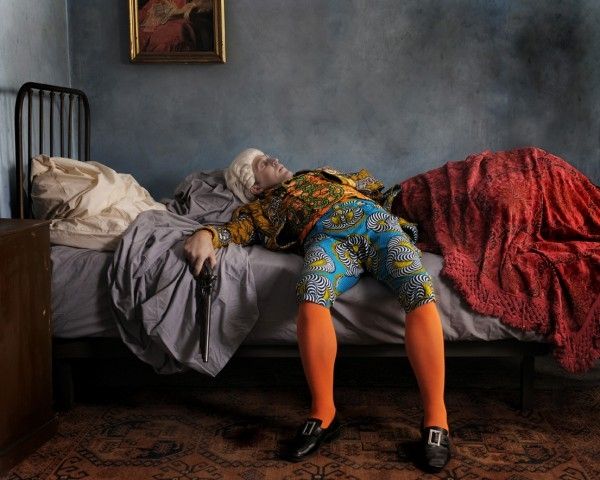 Yinka Shonibare's photograph, 'Fake Death Picture,' restages Henry Wallis’s famous painting of the death of Chatterton, using Dutch wax print fabric. These textiles are key to understanding Shonibare’s work. Though often associated with Africa, these so-called "African" prints were initially manufactured in Europe and Indonesia, intended for sale in West Africa. The patterns are applied industrially using wax-resist dyeing techniques, a process adopted and adapted from Indonesian batik. The vibrant colours and bold designs made them popular in West Africa, where they became deeply embedded in local culture. Shonibare uses these fabrics to explore themes of colonialism, trade, and cultural identity. The wax prints in this restaging create a visual tension, questioning notions of authenticity and cultural ownership. The colourful fabric contrasts sharply with the sombre subject matter, prompting us to consider the complex layers of history and the global exchange of goods and ideas that shape our world. Ultimately, Shonibare invites us to rethink established notions of art and craft, prompting us to look beyond the surface and consider the intricate web of materials, meanings, and cultural references embedded within.
