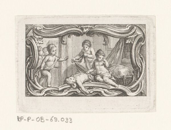 Curator: This is a drawing by Jacques Philippe Le Bas, likely made between 1717 and 1783. It's titled "Vignet met wol oprollende en naaiende putti," currently residing here at the Rijksmuseum. It uses ink, pen, and engraving techniques on paper, and it depicts putti engaged in wool work. Editor: At first glance, there's a sweetness to it, isn't there? It's like peeking into a scene of domestic cherubic labor, softened by that elaborate Rococo frame. Curator: Absolutely. What's fascinating is how Le Bas, working within the Rococo period, is deploying these putti, not just as decorative elements, but almost as little emblems of industriousness. It reflects broader 18th-century social ideals regarding the value of work. Editor: Yes, but it’s a highly selective representation, isn't it? These putti aren’t actually experiencing the conditions of labor that, say, children in factories at the time might be facing. It's a sanitised version, conveniently ignoring the socio-economic realities. It obscures, in a way, through idealization. Curator: A valid point. These images were often commissioned by wealthier patrons and served to reinforce the status quo. But, also consider how prints like these circulated; they weren't just visual diversions; they were pedagogical tools reflecting expectations of behavior across different social classes, offering accessible models, even if aspirational ones. Editor: I see that, yes. The image functions almost as propaganda, teaching particular behaviours by masking inequalities in the existing political systems. In that sense, it mirrors the kind of contemporary visual narratives that gloss over labour abuses that serve global capitalism. Curator: Indeed, the parallels across time can be unsettling. The playful rendition serves a larger ideological project. Even art that seems frivolous is bound within complex socio-political forces, which is why it’s vital to examine its place and function within history. Editor: Analyzing Le Bas' print brings a unique understanding of that entanglement: revealing how seemingly innocent imagery participated in legitimizing prevailing powers, then and now. Curator: Exactly. It encourages a reevaluation of our own perspectives, doesn’t it?