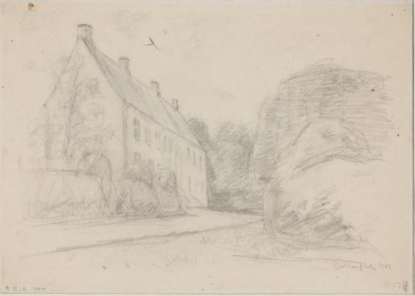 Curator: Here we have "Weg met muur erlangs leidend naar een huis," which translates to "Road with wall along it leading to a house," a graphite drawing with etching attributed to Georges Michel, active between 1773 and 1843. Editor: It’s remarkably bleak. The sketchy lines, the muted tones... it almost feels post-apocalyptic. There's something deeply unsettling about its apparent emptiness, especially in contrast to its implied domesticity. Curator: That’s a compelling reading. It's important to consider the historical context. Michel was working during and after the French Revolution. There were profound societal and economic shifts. Such turmoil impacted the landscapes of the Parisian countryside as industrialization advanced, often replacing a way of life. His depictions were of quickly changing surroundings and could, perhaps, mirror social disarray. Editor: So you’re suggesting the desolate feeling may reflect the broader social experience of the time? Curator: Precisely. Landscape art often carries societal messaging; Michel presented not the glorious landscape of the aristocracy, but rather more unassuming landscapes that reflected changes in everyday life. There's little idealization here, is there? He captured the landscape not as a vision of idealized nature, but instead showing the unembellished truth of rapid industrial change. Editor: It makes me consider concepts of displacement. How many homes did this road connect, and how many more would it disrupt? Curator: Exactly. This work makes us ask these questions, considering the subject within a network of history, power, and identity. Its power lies not in spectacle, but rather invitation to consider the socio-economic dimensions it alludes to. Editor: It transforms a seemingly simple drawing into a profound commentary. I'll never look at a rural landscape quite the same way again. Curator: Nor I. It reminds us that even the quietest scenes are entangled with larger historical and political currents.
