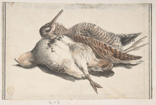 Editor: Here we have "To d\u00f8de bekkasiner" – "Two Dead Snipes" – a watercolor painting by Martinus R\u00f8rbye, painted sometime between 1840 and 1844. The starkness of the birds against the pale background definitely evokes a sense of vulnerability and stillness. What strikes you when you look at it? Curator: It invites questions about humanity’s relationship with nature, particularly within a socio-political context. Snipes are game birds. What does it mean to portray them not in flight, alive and wild, but as trophies, objects? Whose gaze are we adopting here – the hunter's, the artist’s, or something else entirely? Consider the romanticism and realism in play – how do they frame ideas about dominance and control? Editor: I hadn’t thought of it like that – as a statement of control. I was more focused on the realistic portrayal of death. How does the date, the 1840s, influence your reading? Curator: The 1840s were a time of social and political upheaval across Europe. This stillness, this almost clinical observation of death, can be viewed as a quiet reflection of the larger power structures at play in society. The artist, consciously or not, participates in documenting not just the birds but also the values of his time, right? Are these just dead birds, or symbols? Editor: Symbols of the tension between humanity and nature and control – I see what you mean. So, by depicting these birds, R\u00f8rbye opens a discussion of human impact, dominance, and even mortality itself. Curator: Precisely. And it is this layered reading, understanding art as both aesthetic object and cultural artifact, that enriches our experience. We move beyond mere appreciation and engage in critical dialogue. Editor: I’ll never look at a still life the same way again! Thank you for opening my eyes.