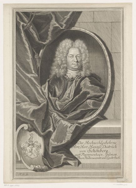 This is Johann Martin Bernigeroth's portrait of Tido Henrich von der Lith, made sometime in the 18th century. During this era, portraiture wasn't just about capturing a likeness; it was deeply entwined with social status and identity. Von der Lith, adorned in the elaborate wig and formal attire, signifies his position as Professor of Eloquence and Philosophy. Bernigeroth, through his engraving, participates in constructing and reinforcing the subject's status within the rigid hierarchies of the time. Consider how the symbols of wealth and intellect operate here. The trappings are meant to convey not just individual identity, but also to align von der Lith with broader notions of enlightenment and authority. This image is a reminder that even personal portraits can be powerful tools in shaping public perception and reinforcing societal norms.