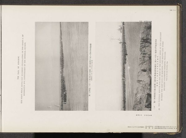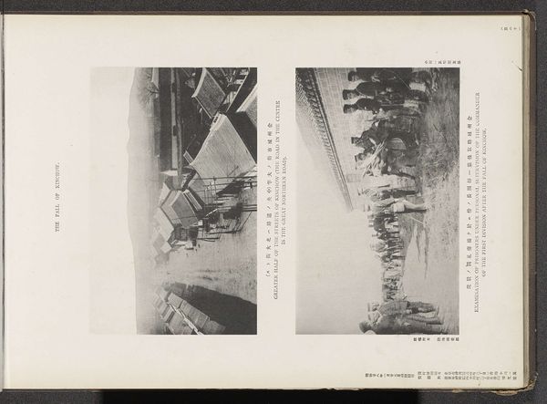 Editor: This fascinating gelatin silver print, "Japanse leger nabij Port Arthur," likely from 1894 and attributed to the Ordnance Survey Office, is quite striking. It depicts scenes related to the fall of Port Arthur. I am struck by the contrasting imagery; the stoicism of soldiers marching in formation beside the apparent ruins or fortification in the other photo. What’s the historical context surrounding these images? Curator: This print provides valuable insight into the socio-political dynamics of the time, specifically focusing on the First Sino-Japanese War. Images like these served specific purposes; how do you think documenting military actions and field hospitals reflects the role of photography during conflict? Editor: It's like they wanted to portray themselves in a certain way and, at the same time, reveal parts of war. Maybe it was used to shape public opinion or justify the war efforts back home? Curator: Exactly. And consider the "Ordnance Survey Office" as the creator. They weren't neutral observers; they were a government entity. How does knowing this affect your interpretation of the scene with soldiers? Is this objective reporting, or something else? Editor: It makes me wonder if they were promoting their version of reality through the lens, strategically framing the images to highlight their army’s capabilities, or downplay the devastation. Curator: Precisely! This photograph then isn’t just a record; it’s an act of constructing a specific historical narrative. Examining its circulation, audience, and intended impact allows us a fuller view. It brings questions to mind regarding image manipulation for national narratives at this early time in photography’s life. Editor: So true! Seeing how carefully planned photographs like these could reinforce a dominant political stance makes you critically look at everything differently. It sheds light on the manipulative aspect of imagery! Curator: Precisely. It encourages deeper inquiries into who controls imagery and their purposes. A print, when examined in depth, offers historical perspectives.