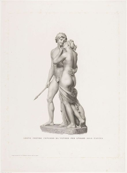 Editor: This is "Brothers" by Edwin Roffe. It's difficult to put my finger on a specific date, but the work depicts two children embracing—one dark-skinned and one light-skinned. The child with darker skin wears a shackle on his ankle. What strikes you most about the symbolism at play here? Curator: The shackle is indeed a potent symbol, evoking captivity, but also the restrictive societal roles imposed upon Black individuals. The embrace suggests unity, perhaps even a utopian vision. But who gets to imagine this unity? Editor: That's a good question. It makes me think about the artist's perspective versus the lived experience. Curator: Precisely. Consider how the figures' classical style might serve to legitimize or even sanitize the complexities of race and power. The image offers reconciliation but lacks true liberation. Editor: Thanks, that helps me see more than I initially did!