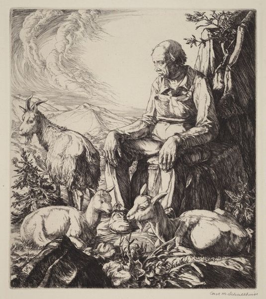 Editor: Here we have Leonardo Alenza's etching, "They Strut About Elegantly", created sometime between 1807 and 1845. The longer I look, the stranger it becomes! There's this proud turkey surrounded by a crowd of rather grotesque faces. What do you see in this piece? Curator: It's a fascinatingly bizarre image, isn't it? Notice how Alenza uses the turkey, a creature often associated with a certain… puffed-up pride, as a central figure. It’s elevated, almost worshiped, by these rather unflattering visages. What kind of symbolism do you think he's trying to convey with the placement and appearance of those faces? Editor: Well, their expressions seem almost mocking or… resentful? Is he suggesting that vanity is fueled by envy or the objectification of others? Curator: Precisely! The faces, each uniquely grotesque, appear to be both supporting and simultaneously demeaning the turkey’s "elegance". It speaks volumes about societal power structures and the performative nature of status. These faces – do they remind you of any specific social types you have seen portrayed? Editor: Now that you mention it, they have echoes of political caricatures or even social satire. So, he's using visual shorthand to comment on vanity and power dynamics? Curator: Absolutely! He’s tapping into a long tradition of using animals and distorted human forms to expose societal flaws. Think about the use of animal symbolism through time, as you interpret this print. How does Alenza invert these conventions, and to what effect? Editor: This makes me consider the title even more. "They Strut About Elegantly"—the artist uses the word "they", implying it’s not just the turkey exhibiting arrogance but the whole assembly! I initially only saw the surface image of funny figures! Curator: Indeed, and that's the brilliance of symbolic imagery. It allows for multiple layers of interpretation, revealing deeper truths about ourselves and the world around us. Editor: I’ll definitely be pondering the hidden meanings behind seemingly simple images from now on. Thank you!