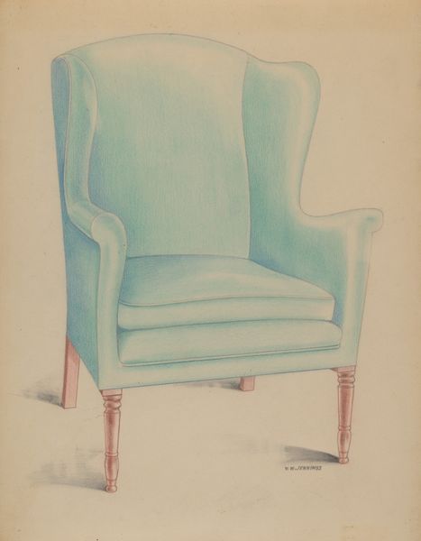 Editor: This is "Chair, Wing, Turned Front Legs," a watercolor and colored pencil drawing by George Loughridge, made around 1936. It strikes me as a very formal and slightly austere depiction of a household object. What catches your eye about this piece? Curator: Well, beyond the somewhat stiff formality you mentioned, I'm drawn to the labor involved in its construction, both in the chair itself and in its representation. Think about the timber milled for the legs, the upholstery work, the dying and weaving of the striped fabric; not to mention Loughridge’s artistic decisions about the colors, perspective and materials used. Does this suggest a mass-produced item, or something more bespoke? Editor: Given the detail, it leans towards bespoke. How does knowing it's likely handcrafted change our understanding? Curator: It asks us to consider the social context. Who commissioned such a piece during the 1930s? What does this reveal about economic disparities and access to luxury during the Depression era? And looking at the drawing itself, how does the application of watercolor, versus, say, oil paints, reflect on artistic choices linked to cost and accessibility of materials? Editor: So you are saying the chair becomes more than just a chair, and the drawing is more than a rendering? Curator: Exactly. It is all about how art is intrinsically connected to material production, economic forces, and the social relations of its time. Thinking about that connection elevates our perception beyond aesthetics alone. What is more interesting than that? Editor: That gives me a lot to consider, examining art from the standpoint of labor, materials and its cultural significance! Curator: Precisely! Art offers valuable insights into the production and consumption patterns within a given society. Now, I have a question for you…