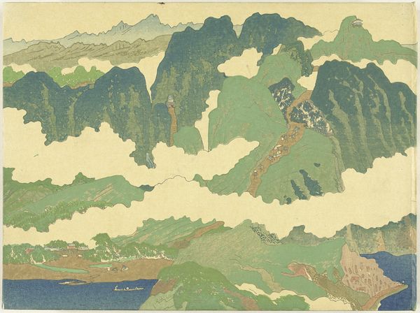 Editor: Here we have Utagawa Kuniyoshi's woodblock print, "View of Mt. Asama from the Usui Pass," created sometime between 1840 and 1860. There's something about the small figures dwarfed by the landscape that creates a feeling of vulnerability. What do you see in this piece, considering the context of its creation? Curator: That sense of vulnerability you identify is crucial. Consider this print within the context of the late Edo period. Kuniyoshi, along with other Ukiyo-e artists, was often subtly critiquing the rigid social hierarchy and growing economic disparity through their art. The small figures, indeed, could represent the common person, burdened by their journey and almost swallowed by the vastness of nature and, metaphorically, the oppressive system. How might the landscape itself contribute to this reading? Editor: Well, the mountain is imposing, definitely a strong presence. But there’s also a sense of beauty in the landscape, almost indifferent to the plight of the travelers. Is it fair to assume the landscape can be indifferent? Curator: Precisely! Nature, here, is not romanticized in a Western sense; it is a force, powerful and unyielding. Think about the socioeconomic pressures of the time—famine, heavy taxation, and strict class divisions. Kuniyoshi cleverly uses the landscape not merely as a backdrop but as a symbolic representation of the societal forces acting upon these individuals. Does that change how you see the smallness of the figures? Editor: It does. Instead of just being picturesque, they become symbols of resistance or perseverance against those overwhelming odds. Curator: Exactly. And notice the deliberate choices in color and composition. The subdued tones and the positioning of the figures – almost hidden within the trees – subtly amplify the message of a population struggling to survive within a complex and challenging social framework. The seemingly serene landscape contains a potent commentary on power dynamics. Editor: So, the beauty and scale of the print mask social critique. I hadn't thought about the landscape as a stand-in for the powers that be! Curator: Indeed. This piece is more than a scenic view; it’s a reflection of social realities subtly woven into the fabric of everyday life. This intersection between art and society constantly provides a fresh viewpoint to learn. Editor: Definitely. I'll never look at a landscape the same way again.
