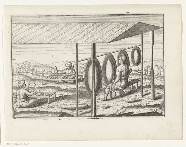 This engraving, "Slaapkamer van de koning van Tuban," made in 1599 by an anonymous artist, depicts the king's bedchamber, a place where sleep, a universal experience, intertwines with power and ritual. Notice the hanging bells above the bed, their symbolism harkens back to ancient practices of marking time and transitions, their sound is meant to ward off evil spirits. The ritual surrounding the king, suggested by figures in the foreground, echoes the ancient traditions of divine kingship. Such rituals evoke a sense of protection and continuity. The prone figure of the king in repose carries echoes of effigies on sarcophagi from ancient civilizations. Sleep itself, a moment of vulnerability, is staged with careful symbolism of power, tapping into a shared understanding of mortality and the human condition. This image, through its symbols, transcends its specific time and place, connecting to a broader, timeless narrative of power, protection, and the human experience.