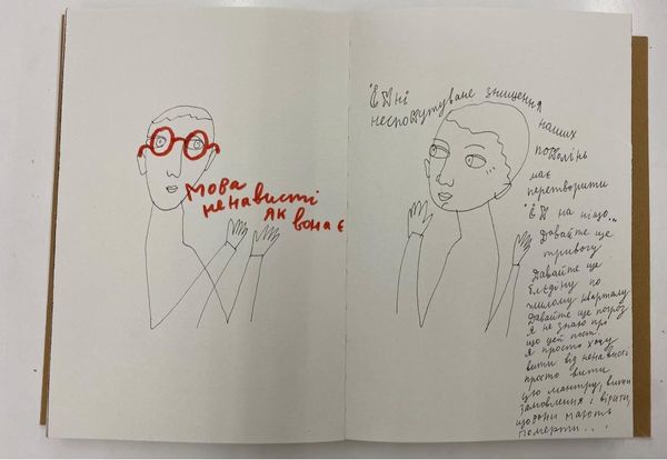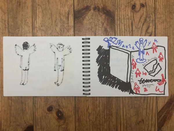 Alevtyna Kakhidze made this untitled drawing with colored pencils. The directness of the marks, and the simplicity of the rendering really gets to me – it feels like artmaking is a way to process events as they happen. The texture of the paper, you can almost feel it, right? And then, the way the colors are laid down, kind of flat and graphic. Look at the floor— it's not about perspective, but about creating a space that holds this figure, Alexander Krolikowski. The writing makes it seem like a poster. The odd yellow gloves and shoes against the blue jeans create this weird tension. I think it’s about the physicality of being there, in that moment. It makes me think of artists like Philip Guston, who used simple forms to address complicated political issues. Art isn’t about answers, it’s about asking questions.