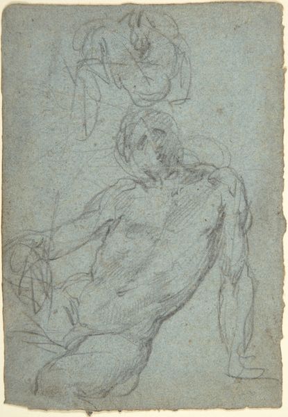 Editor: This drawing, "The Dead Christ" by Antonio Balestra, from around 1721, uses charcoal and pencil to depict a nude male figure. I’m struck by how vulnerable the body appears, almost collapsing in on itself. What do you see in this piece? Curator: Beyond the obvious religious connotations, I see a powerful exploration of human mortality, echoed across countless artistic renderings of the fallen Christ. Balestra uses the symbolism of the body, the relaxed pose, to convey the profound silence of death, the abandonment of the physical form. The use of red chalk evokes the blood, the sacrifice… but also, perhaps, a raw, exposed vulnerability we all share. How does the composition contribute to this feeling? Editor: The way the body seems to curve and droop makes it feel like there’s no strength left, adding to the vulnerability. Curator: Precisely. The pose isn’t heroic; it's yielded. Think of the long artistic tradition of the “deposition” scenes, the removal of Christ's body from the cross, repeated so often that the imagery is etched in our cultural memory. Here, Balestra focuses on the aftermath. Consider the Renaissance obsession with idealized forms. Does Balestra adhere to that ideal, or does he offer something…different? Editor: I think it's different. The realism, the lack of idealization makes it feel more personal, more real somehow. Curator: Yes, and this shift signals a changing cultural focus – away from divine perfection and toward human empathy. What have we discovered looking at it today? Editor: I hadn't considered how the drawing engages with this visual history of representing death and suffering. Curator: Exactly, understanding those symbols help us realize how "The Dead Christ" builds on a dialogue with our collective visual memory, offering new layers of emotional significance.