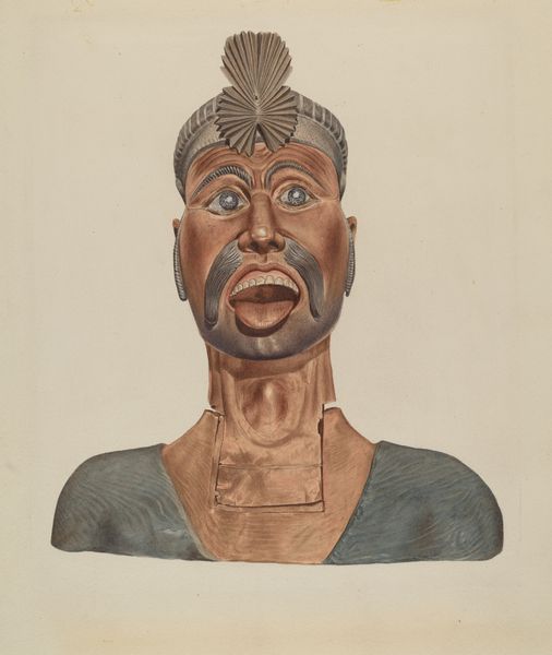 Curator: Looking at this watercolor by Mary E. Humes, dating from around 1938, I’m immediately drawn to the almost ghostly rendering of what appears to be a ship's figurehead. It's intriguing, the visible cracks in the painted surface give it a worn, aged feel. Editor: Yes, the cracks evoke age, but what strikes me is how it frames the romanticized idea of the "Indian Princess"— a construction heavily steeped in colonial narratives and the male gaze. Note the term: It suggests a specific type, erasing diverse indigenous identities, doesn't it? Curator: Absolutely, and it makes me think about the material reality of its production. Someone carved that figurehead, likely a skilled artisan, and the original function aboard the ship, battling the elements, now reduced to an image. I'm wondering who these crafts people were, were they local or brought in? The process and the skill behind the art have its own kind of impact. Editor: Precisely. The title’s deliberate appropriation of "princess" speaks volumes about the power dynamics at play. It transforms indigenous women into objects, possessions even, within a Western, colonial framework. Notice the necklace, rendered with painstaking detail, drawing our eye to notions of beauty, class, and idealized roles that might not have existed prior to European contact. Curator: The layering of the necklaces themselves seem to carry weight – literally and figuratively! They emphasize how decoration plays an interesting, albeit potentially complex, role in the craftsmanship of the image. It raises the question of value too, given that Humes painted this, there is an interesting interaction going on with artistic representation. Editor: Representation indeed. Humes' choices serve not merely as art but a perpetuation, however unconscious, of existing stereotypes, continuing problematic trends that linger still in the art world and the social fabric. Curator: I’m left considering the hands that built it. Thinking about their own influences in the creation process of this Indigenous representation in an artistic context that simultaneously elevates and essentializes this depiction. Editor: And that essentializing – a critical reminder that this artifact needs continuous scrutiny in terms of what cultural biases and social structures it represents.