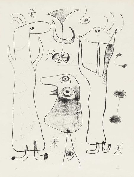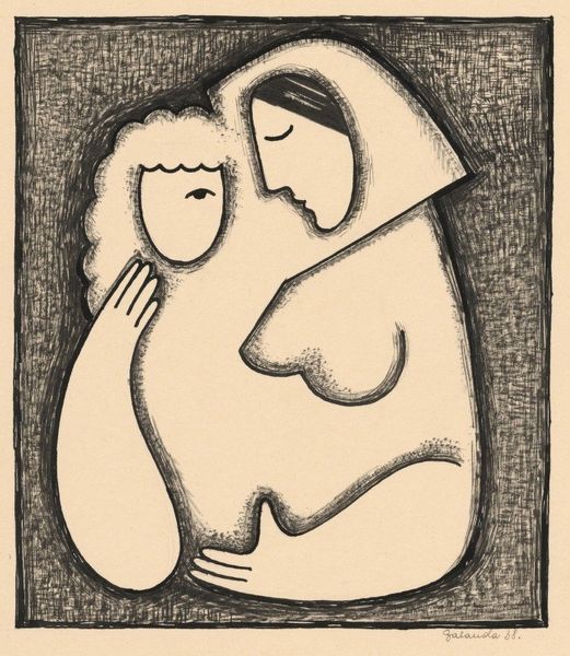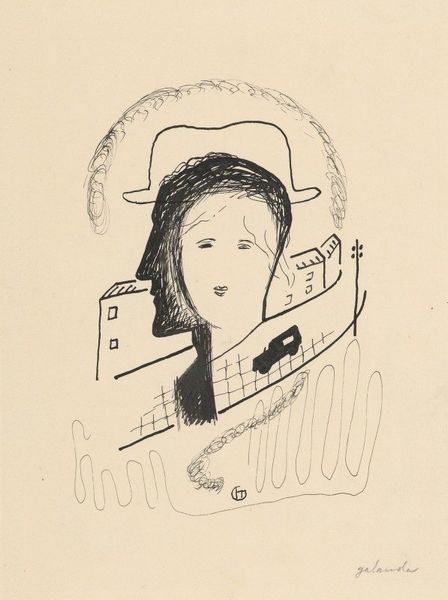 Editor: This is "Ball," a 1930 ink drawing by Mikuláš Galanda. The composition feels both simple and unsettling. The stark lines and stylized figures are quite striking. How do you interpret this work, considering its historical context? Curator: This piece speaks volumes about the artistic currents of its time. Galanda was working in Czechoslovakia during a period of intense social and political change. The rise of modernism, with its rejection of traditional forms, often reflected a questioning of established authority. Do you see that reflected in the work itself? Editor: I think so. The distorted, almost mask-like faces feel like a rejection of classical portraiture. There's also something about the isolated balloon – is it symbolic of childhood innocence lost, or perhaps a fragile hope? Curator: Precisely. The balloon could indeed symbolize fragility in the face of societal pressures. Consider the influence of Expressionism at the time; artists were using distorted forms and bold lines to express inner turmoil and critique societal norms. How do you think this piece functions as a form of social commentary? Editor: Perhaps it's commenting on the dehumanizing effects of industrialization and the alienation of the individual in a rapidly changing world? The figures do seem detached and impersonal. Curator: Exactly! Galanda's work wasn't just about aesthetics; it engaged with the anxieties and uncertainties of its era, challenging viewers to confront the realities of modern life. Editor: I hadn't considered the socio-political undertones so explicitly, but now it seems impossible to ignore. It's much more than just an image of faces and a balloon. Curator: The power of art lies in its ability to both reflect and shape our understanding of the world. And Galanda was very active within the public debate about modernism in Slovakia. It’s interesting how such a seemingly simple drawing can hold so much complexity, isn't it? Editor: Definitely! I'm walking away with a much deeper appreciation for Galanda’s "Ball" and its place in history. Thanks for sharing your insights.