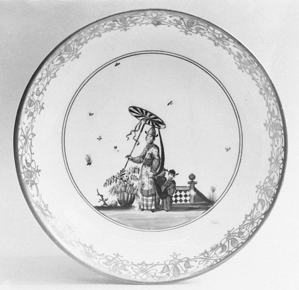 This plate was created by Fidelle Duvivier in the 18th century, using ceramic material. Specifically, it’s made of earthenware covered with tin glaze, a technique that gives it a bright white surface perfect for painted decoration. The process of making such a plate was complex, involving skilled labor at every stage. Potters formed the clay, and then other artisans applied the glaze and meticulously painted the design you see here. The central image, a pastoral scene framed by foliage, is typical of the period's taste for idealized nature. The scalloped edge adds a touch of refinement. Such plates weren’t just functional objects; they were also displays of wealth and taste. Owning finely crafted ceramics signaled one’s status in society. This plate reflects the broader social and economic context of its time, where craft production was intertwined with issues of labor, consumption, and social class. Examining the materials and making of objects like this helps us appreciate their full cultural significance, blurring the lines between craft and fine art.