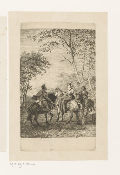 This etching, by Karel Frederik Bombled, captures a scene of horse riders rendered with delicate lines. The riders on horseback evoke images of power and control. The horse itself has been a symbol of vitality, energy, and nobility throughout history. Consider the equestrian statues of Roman emperors, where the rider on horseback signifies military might and imperial authority. Here, the riders are set amongst vegetation, suggesting a harmonious relationship between man and nature, yet even in that setting the horse can still convey a sense of dominance. The composition and posture suggest a collective memory that transcends time. The image reflects how symbols evolve to convey meaning and resonate deep within our cultural subconscious.