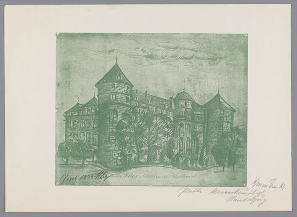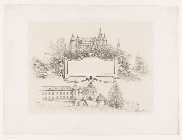 Curator: We're looking at Jan Striening's "Kasteel Twickel," a pencil and ink drawing possibly from 1859. It's quite delicate, wouldn't you agree? Editor: Yes, there's a quietness to it. Almost like a memory fading at the edges. What historical forces might have shaped the artist’s representation of this castle? Curator: Consider the rise of Romanticism in the 19th century. There was this fascination with history and the grandeur of the past, often tied to ideas of national identity. How do you think this drawing reflects that cultural context? Editor: It feels idealized, presenting a stately image, but without showing any signs of life, perhaps suggesting the aristocracy was disconnected from contemporary society? Curator: Precisely! Castles were often viewed as symbols of power, but by the mid-19th century, that power was shifting. Also think about the purpose of an image like this. Was it intended for public display or a more private audience? Editor: Based on its sketch-like quality and "aged paper" tag, perhaps this drawing was personal—a preparatory work or simply for personal enjoyment? If public art serves to affirm institutional power, how can something like a private sketchbook page be a form of resistance? Curator: That's an interesting thought. By not participating in the grand narratives promoted by the art establishment, it creates its own quiet narrative. This work may subtly critique that established public perception. The way he captures the building with just pencil—without idealizing—reflects honesty perhaps. Editor: So it could be argued that in its modesty, the work is more subversive. I hadn't thought of it that way. Thanks! Curator: It's a pleasure. Sometimes the most profound statements are made in the quietest of voices.