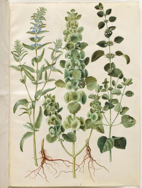 Editor: This watercolour and gouache work, dating from 1649-1659, is by Hans Simon Holtzbecker, and it depicts three types of nettles. There's a beautiful detail in the roots, stems, leaves. They're so carefully observed! It’s quite striking, the plants feel almost imposing. What do you see in this piece? Curator: I see a quiet form of rebellion. Holtzbecker, during the Northern Renaissance, chooses to immortalize nettles, plants often dismissed as weeds, things to be eradicated. Why elevate them to the realm of art? I believe it's a subtle commentary on value. What dictates which life forms are deemed worthy of our attention and, by extension, our respect? Editor: So, you're suggesting that it's not just a botanical study, but a statement? Curator: Absolutely. Consider the period. There was enormous social stratification, a rigid hierarchy. By celebrating these often-ignored plants, Holtzbecker, perhaps unconsciously, challenges this hierarchy. He seems to say, "Look closely, there is beauty and complexity in the seemingly insignificant." How does his rendering of traditionally 'undesirable' plants inform conversations on class and societal expectations? Editor: I never thought about botanical art in that way. I suppose it speaks to ideas of marginalisation. Curator: Precisely. Art can unveil societal assumptions. The botanical drawing becomes a potent tool. What if, today, we re-examined which art institutions collect, and whom they deem valuable for study? What nettles are being overlooked now? Editor: This definitely shifts my perception. I came in thinking it was simply a detailed nature study, but it could be that Holtzbecker’s study of nature could become an invitation to challenge perspectives, on nature and perhaps social structures too! Curator: Indeed. Let's carry that thought with us as we look at other artworks here today!