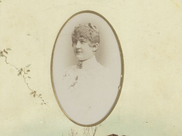 Curator: Let’s take a look at a work titled “Portret van een jonge vrouw met een bloem op haar jurk,” or “Portrait of a Young Woman with a Flower on her Dress,” made sometime after 1881 by Louis Oskar Grienwaldt. It's an albumen print, a type of photography common in that era. What strikes you first about it? Editor: The immediate feeling is one of serene melancholy, almost a Victorian daydream. The oval format and sepia tones definitely contribute to that. The young woman’s gaze is directed away, lost in thought. It feels very posed, in that composed stillness so common to early portraiture. Curator: Absolutely. These kinds of studio portraits were carefully constructed to convey a certain social standing and virtue. The young woman’s simple but elegant dress, the single flower – likely a rose – pinned to her bodice, all speak to a cultivated middle-class identity. Photography served as a way to document and reinforce those social norms. Editor: I'm drawn to the rose itself. In that era, roses carried significant weight in the language of flowers, often representing love and beauty, but depending on its color and condition, a darker rose like this could signify mourning or remembrance, maybe a love that is not fully realized. It contrasts with the otherwise delicate features and ornamentation. Curator: The use of photography here moves beyond mere documentation and gets more interesting in this period. Grienwaldt, by emphasizing the flower and employing that oval frame, aligns this photograph with the traditions of painting and miniature portraiture, therefore making a case for its status as a form of high art. Editor: The way she is facing away almost suggests the sitter has inner-conflict or reservation about society’s expectations, but she's also showing pride, so she doesn't appear defiant. What is fascinating is this is how much the setting influences even these types of portraits; it says so much, doesn't it? Curator: Definitely, Grienwaldt's piece encapsulates the social ambitions and constraints of its time, mirroring an attempt to reconcile the objectivity of the camera with the expressiveness of artistic representation. The interplay of the two artforms brings history to life. Editor: Absolutely. It makes me consider our ways of portraiture today, how technology has influenced cultural symbolism and vice-versa. Thanks for offering such insights.