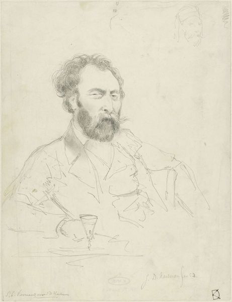 Curator: This charcoal drawing, held here at the Rijksmuseum, offers us a glimpse of the painter and photographer Maurits Verveer, crafted between 1836 and 1900, possibly as a self-portrait. Editor: He looks like he’s peering into another dimension with that pipe; it gives a kind of melancholic haze to the whole piece. It's quite striking in its subdued romanticism. Curator: Absolutely. You notice the toned paper right away. Verveer’s employment of charcoal in such detail suggests a deliberate consideration of the medium’s capabilities— its accessibility but also its capacity for rendering nuances of light and shadow and therefore feeling. What might the ready availability of charcoal mean for a painter’s approach to preparatory sketches or even finished pieces? Editor: I'm intrigued by his grip on the pipe; it seems more like he is holding it captive. Perhaps that captures the relationship between an artist and his tools—or perhaps his vices. Curator: Precisely. Consider the implications: portraiture, often a commission-based practice, here intersects with what might be an internal investigation. Did Verveer produce this drawing as a preliminary sketch for a painting, a means to contemplate his self-image and how artists were perceived and rewarded during his time, or was it purely for artistic exploration and the intimacy between creator and material? Editor: Or maybe it’s just how he relaxes after a long day wrestling with cameras and chemicals in the darkroom! There is something intimate about drawings that paintings often lack, wouldn’t you agree? They capture a mood so viscerally. It almost invites the viewer to speculate or project... Curator: I appreciate that reading. Reflecting on materiality again, charcoal's ephemeral nature brings a beautiful transience to the themes explored within the portrait itself. Verveer might then be telling us that identity—artistic or otherwise—is always in a state of creation and dissolution, dependent on specific contexts and acts of interpretation, as in drawing on the blank page, that requires physical labor. Editor: A dance of dust and dreams. And with that thought, I feel strangely satisfied looking at it all now; all that speculation opens some possibilities to ponder about perception, portraiture, and fleeting moods, to carry with us outside this hall, into other days. Curator: Indeed. Examining process alongside artistry unveils intricate dialogues about who gets to make art and why; It certainly elevates our viewing beyond merely admiring a nice drawing.