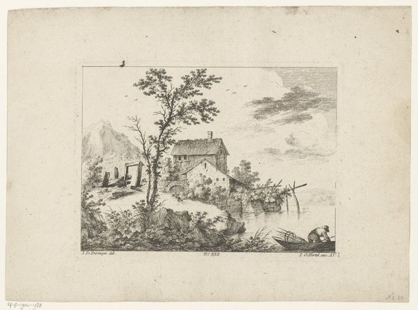 Editor: This is "Village Road with a Farm and Sheds" by Johannes van Doetecum I, created sometime between 1559 and 1561. It's an etching, isn’t it? I find the intricate line work creates such a detailed, yet calming atmosphere. What captures your attention when you look at this print? Curator: Calming is a lovely way to put it! I’m transported to a simpler time, honestly. The scene is so meticulously rendered, isn't it? You can almost feel the quiet rustle of leaves. What I find truly striking is how Doetecum captures the mundane aspects of daily life, elevates them, almost sanctifies them through this careful artistry. The northern renaissance had a love for detail and accuracy but was there a philosophical or cultural push behind it too? Editor: A sanctification of the mundane? That’s a lovely way to put it! I hadn’t considered that. The attention to detail certainly seems driven by something beyond mere representation. So how does that link into broader themes? Curator: Well, think about the era. The Reformation was underway, religious art was being questioned... perhaps artists were turning to the natural world, and the everyday lives of ordinary folk, to find a different kind of truth, or even beauty? To find the divine, so to speak, in the here and now. Notice how he uses the very thin lines to make up the shapes, almost meditative! What's your take? Editor: It's fascinating to think of landscape itself becoming a kind of devotional object. And I can see how this focus on detail might be a reflection of a new way of seeing the world. The detail isn't just detail but information! This changes my initial take completely. Curator: Exactly! It shows how art acts as an echo chamber of a certain worldview. Something that began from one view of reality changed into a message of its own! The most curious form of message! Editor: Right? It gives me goosebumps to know this piece can communicate different context in different periods. Curator: Indeed. So much from so little lines etched on a plate. The quiet voice speaks volumes, still today.