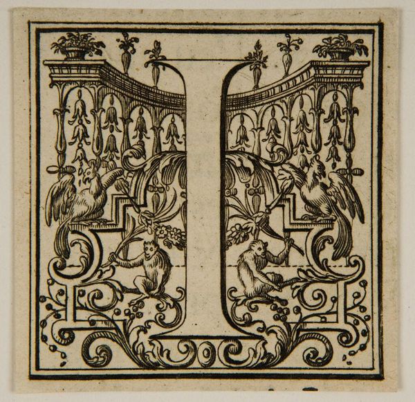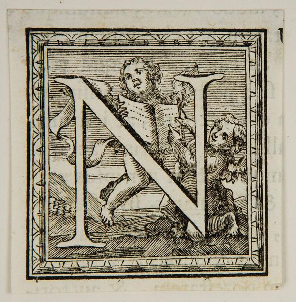 Editor: Here we have "Letter I," its creator unknown. I’m struck by the contrast—the crisp letterform amidst the swirling figures. What do you make of this little world? Curator: Ah, a glimpse into a world where letters dance with cherubs! I see a playful exploration of form and meaning. Perhaps this letter "I" isn't just a letter, but an invitation to imagine stories, identities, inner worlds. What kind of story do you think it suggests? Editor: Maybe a story about innocence and knowledge, with the letter symbolizing the beginning of something. I didn't initially think of it that way! Curator: Precisely! It's a reminder that even the simplest forms can hold a universe of possibilities.