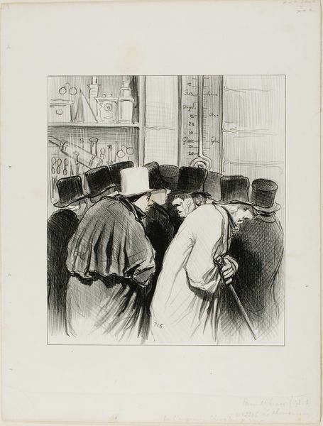 Editor: Georges Hermann Rene Paul's etching, "Men at a Funeral," from 1895, captures a group of somber men in top hats. It’s stark and bleak, almost overwhelmingly so. What story do you see unfolding here? Curator: Ah, yes, "Men at a Funeral." It’s an image that seeps into your bones, doesn’t it? What strikes me most is the collective grief. It is so visible, isn't it? But beyond the obvious sadness, I find a profound sense of shared humanity. Have you noticed how each face, though downcast, is distinctly rendered? Editor: I do see that now, yes. They aren't just a mass of mourners. Each man seems to carry his own individual weight of sorrow. Curator: Exactly. It’s like a visual poem about mortality and the communal experience of loss. And etched in 1895 – one can imagine a pall of collective loss hanging over the western world back then. There's a beautiful touch of symbolism, too, almost blending the group portraits with a feeling of genre painting, wouldn’t you say? What thoughts spring to mind? Editor: The darkness, almost oppressive, contrasts with that small patch of white flowers at the base. Is that symbolic? Curator: Most certainly. The flowers offer a poignant whisper of hope amid despair, a delicate promise of renewal in the face of death’s finality. You know, the power of art often resides in its capacity to hold seemingly contradictory truths, and doesn't this little tableau beautifully remind us? What will you take away? Editor: That contrast will stick with me. The work isn't just depressing; it is making a larger point. Curator: Indeed. A reminder that even in darkness, beauty and hope can still bloom.