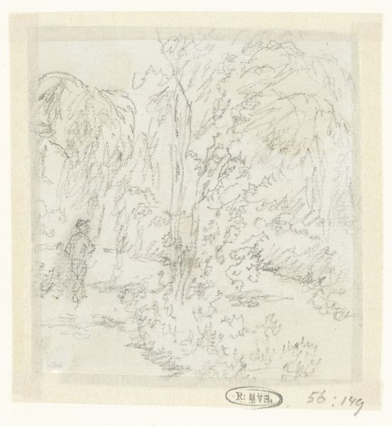 Editor: Here we have "Boslandschap," or "Wooded Landscape," a pencil drawing from somewhere between 1840 and 1880 by Johannes Tavenraat. It's currently held in the Rijksmuseum. It feels very simple, almost like a study, but the composition with that tiny figure walking into the trees is quite engaging. What do you see in this piece from a more formalist perspective? Curator: What I appreciate most is the way Tavenraat uses line to create depth and texture. Notice how the density of the pencil strokes varies, creating areas of light and shadow that define the forms of the trees. Consider also the application of what appears to be some type of watercolor wash adding an additional depth and texture. Do you observe the intentional framing within the work itself? The artist meticulously contains their drawing through use of border line and limited tonality of the applied pencil medium. How do you read the artist's use of semiotics to construct and compose this representational form? Editor: Yes, I see it now. The border really contains the work, creating a sense of intimacy, while the varied pencil strokes, in a kind of layering, certainly gives dimension to the forest. It almost becomes tactile. You ask about how to read the semiotics, which leads to so many ways we can interperet it. It could symbolize limits but freedom, simultaneously? Curator: Precisely! The structural interplay between constraint and release – that is to be contained by this box while inviting endless possible interpretations from those willing to view it -- it gives the work its dynamism. The composition isn't just a depiction of a landscape. Editor: So, by focusing on those formal elements – the line, the tone, the composition – we can see how Tavenraat creates meaning and evokes something deeper than just the visual scene. It goes far beyond the physical representation and opens infinite creative narratives. Curator: Indeed. The aesthetic value exists autonomously, even independently from any historical or cultural context, right here in the artwork's materiality. The material structure speaks for itself. It exists here in real time, not an appropriation of some romantic fantasy. What did you gain from looking at the materials, semiotics, structuralism, and philosophy? Editor: By understanding the physical elements, one comes closer to unlocking and defining the aesthetic representation intended by the artist, creating that unique story. I like that idea!
