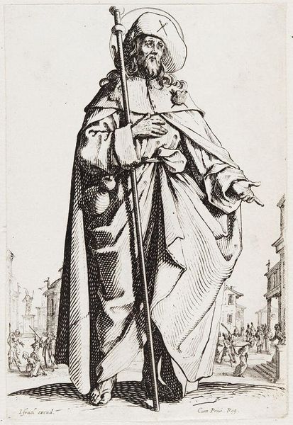 Editor: This etching by Jacques Callot, titled "Lady Wearing a Large Veil and a Fur-Trimmed Robe," has an incredible amount of detail for such a small print. All that fur looks so soft! What stands out to you about this work? Curator: Considering this print, I'm drawn to the economics of attire. Look at the sheer volume of material – the fur trim, the veil. This wasn't just fashion; it was a display of wealth and power tied directly to the production and trade of textiles and furs. How does knowing this change your perspective? Editor: That definitely shifts my focus! I was initially only thinking about the aesthetic qualities, but now I'm thinking about the labor and resources required to create that robe and veil. Curator: Exactly. Callot’s print becomes less about the individual and more about the system that allows such garments to exist. It's about materiality, labor, and ultimately, consumption.