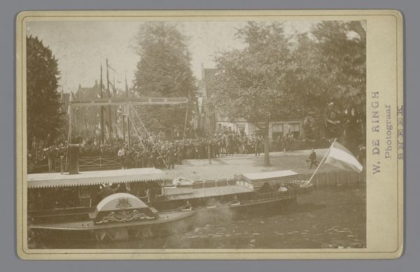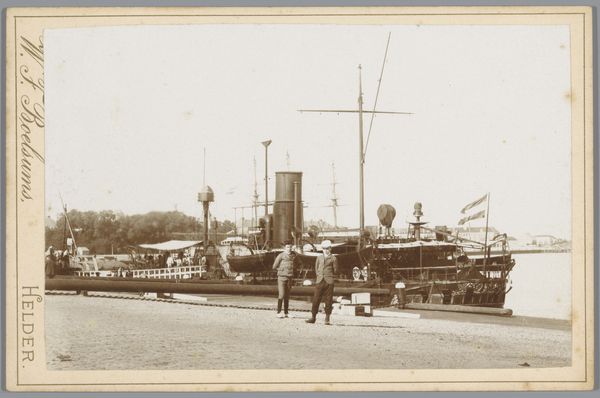 Editor: So, this photograph, titled "Kanonneerboot Zr. Ms. Braga in de haven van Den Helder", dates from between 1880 and 1903. It’s a gelatin silver print, depicting a warship in port. I'm immediately struck by the sepia tone, giving it this antiquated, almost melancholic feel. What do you see when you look at this piece? Curator: Beyond the obvious historical document of a Dutch gunboat, I see a confluence of power, industrial progress, and national identity being meticulously constructed through a carefully chosen visual language. The crisp details afforded by the gelatin silver process contrast sharply with the rather romantic sepia tone, creating a tension between modernity and nostalgia. This photograph begs questions about the relationship between the Netherlands and its maritime power, and how this power was, and continues to be, presented and consumed by the public. Consider the framing of the image – the inclusion of figures, seemingly workers, anchoring the warship. What statement is being made by contrasting the individual with the war machine? Editor: That’s a compelling point about contrasting the individual and the war machine. I hadn’t really considered it in terms of power dynamics. I was focusing more on the visual aesthetic and its historical context as just a depiction of its time. Curator: Exactly. It’s crucial to dig beneath the surface, beyond its apparent aesthetic appeal. What ideological narratives are being constructed? How does this image reflect broader socio-political currents? For instance, what role did the Dutch Navy play during this period, both domestically and in its colonies? How might this image have been used as a tool for bolstering national pride? These are crucial considerations to challenge any notion of this image as merely a neutral historical record. Editor: This makes me rethink the entire meaning of the photograph. It's not just about seeing an old warship; it’s about understanding its cultural and historical significance in shaping identity and projecting power. Thanks, that gives me a new perspective. Curator: Indeed, questioning presumed neutrality and understanding art’s role within broader cultural conversations allows for richer appreciation, one that reflects critically upon intersectional elements of power and meaning.