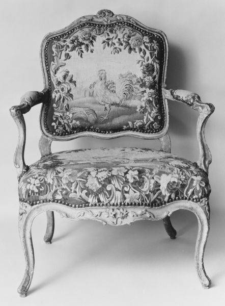 Editor: This is an armchair, part of a set of nine, dating back to between 1730 and 1765. It is currently held at the Metropolitan Museum of Art, and it’s an object crafted with wood carving and textile weaving. The Rococo style is unmistakable. What strikes me is how the scenes depicted are of nature and serenity, while the actual object is so clearly one of luxury and status. What do you see in this piece? Curator: I'm drawn to the production of this object – a material study, if you will. The confluence of carving and weaving, high art and craft, points to the complex social fabric of the time. Consider the labor involved in each step. How many artisans contributed, and what were their social standings? The wood, the textiles...where did these raw materials originate, and what does that say about trade and consumption patterns in the 18th century? Editor: That’s fascinating! So, beyond just appreciating the finished aesthetic, we should also be considering the journey each material took, and the human effort behind every curve and stitch? Curator: Precisely. This armchair isn't just a seat; it's a node in a vast network of extraction, production, and consumption. By examining the means of production, we gain a deeper understanding of the economic and social realities that shaped its creation. The landscapes on the textile might speak to the owners view, but for me it invites questioning. How does something become precious, and for whom? How did the landscape become just a decoration, separate from life, on such an object? Editor: It makes me see how art isn't just about beauty but a complex layering of social and economic stories. It certainly prompts you to ask the tough questions about what something means. Curator: Agreed. By scrutinizing the materiality of objects like this armchair, we start to dismantle the traditional hierarchies within art history itself.